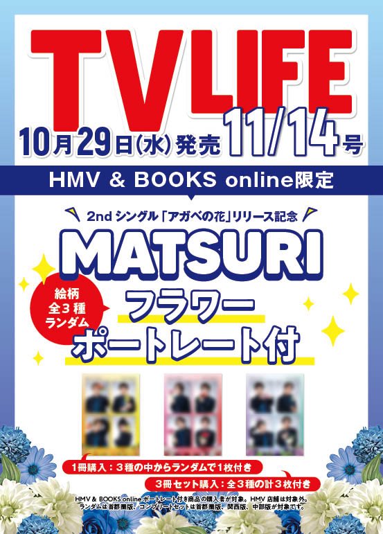 2025.10.29【MATSURI】TV LIFE(10月29日発売号)10月29日(水)発売のTV LIFEにMATSURIが登場! 2nd Single「アガベの花」リリースを記念して、HMV&BOOKS onlineで花をテーマにしたオリジナルポートレート付き商品を発売! HMV&BOOKS onlineはこちらから 〈フラワーポートレート1枚付き TV LIFE首都圏版〉 〈フラワーポートレート全3種コンプリートセット付き TV LIFE3冊セット〉